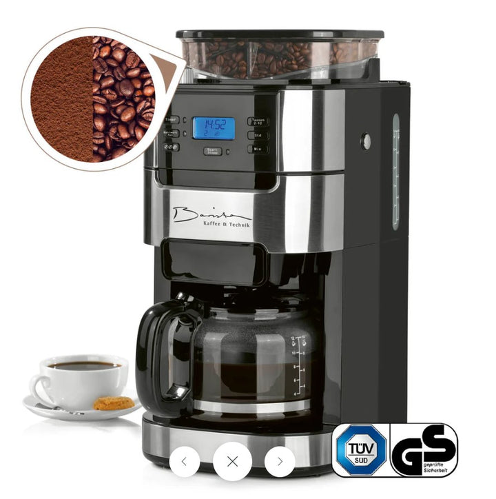 Barista Kaffee & Technik Filter coffee maker with adjustable grinder and glass jug | warm keeping function, 24h timer and permanent filter | For 12 cups of coffee | coffee machine for beans and powder